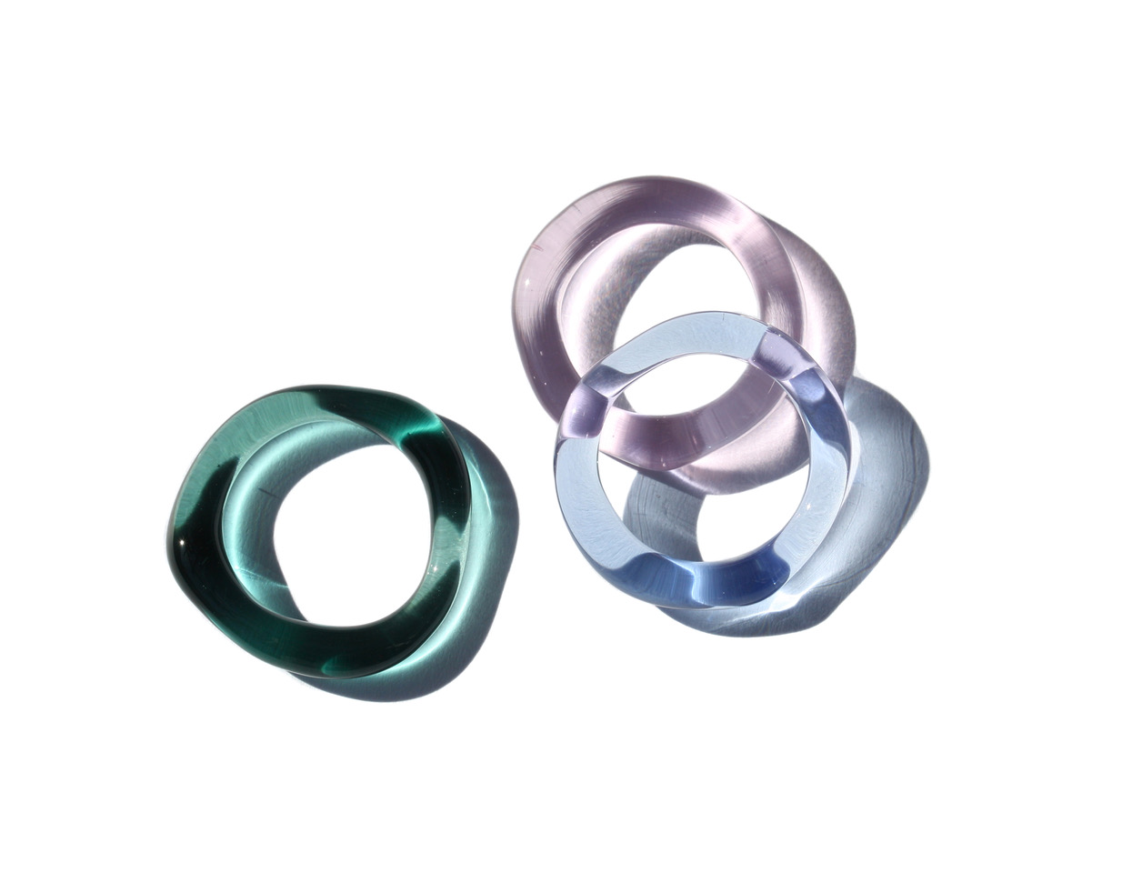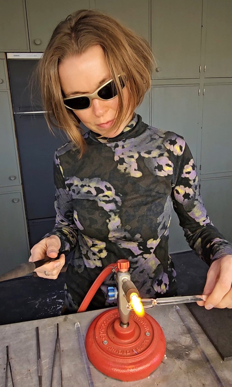 Jedes Schmuckstück entsteht direkt in der Flamme am Brenner. Borosilikatglas wird dabei zu organischen Formen, die sich frei kombinieren lassen – ein ewiges Spiel aus Transparenz, Licht und Bewegung.